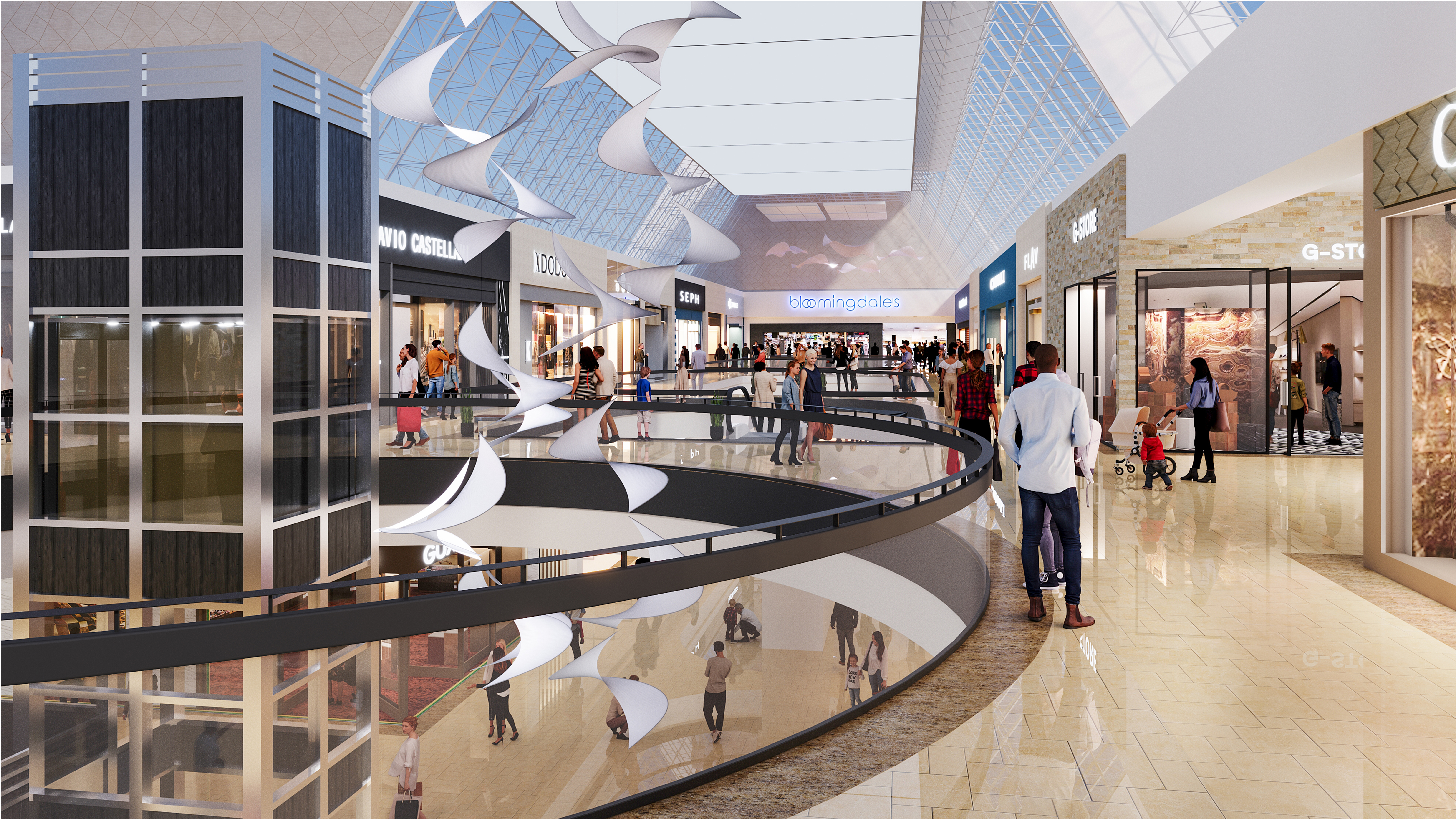 As a luxury shopping environment, The Shops at Chestnut Hill takes pride in creating a simple yet elegant backdrop for their tenants and customers. The space is flooded with natural light during the day and a soft evening glow at night. This remodel capitalizes on this concept with the addition of white floating ceiling clouds to conceal the exposed space frame, upgraded LED lights, and the introduction of custom art sculptures which will take this project one step further toward a museum quality look.